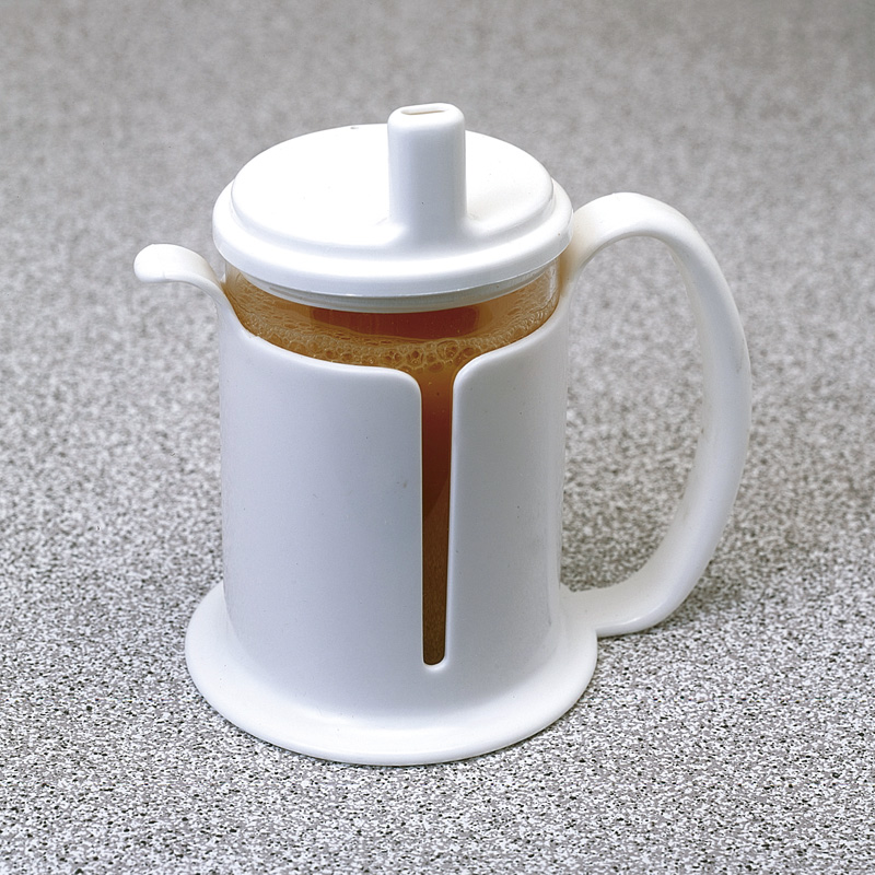 Vaso transparente con tetina de la firma sueca ETAC. El diseño especial del soporte permite agarrar el vaso con seguridad con las dos manos, incluso con poco agarre o tono muscular débil. Apto para microondas. Capacidad 400 ml